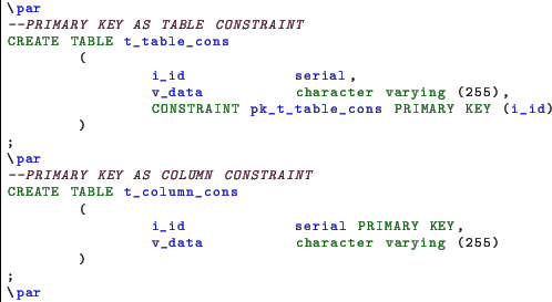 With the table’s constraint definition is possible to specify the constraint name and to have a multi column constraint. When writing a multi column constraint the participating columns should be listed separate by commas.