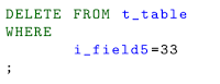 The delete is the simplest of the DML as lists just the target relation and the eventual WHERE condition. The formatting is quite simple as the where condition is the only part which requires to be structured as seen in the select.