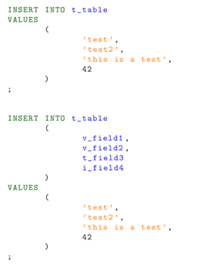 The INSERT statement is composed by two elements, the attribute list and the values list. The lists are positional. The formatting should mark clearly the various elements of the query in order to make it simpler to spot the correspondence between the attribute and the value.