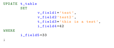 The WHERE condition on the update is the same of the SELECT. Take a look to 1.1.1 for more informations. Just after the table’s name there is the keyword SET and the list of the updates. The formatting should reflect this particular structure.